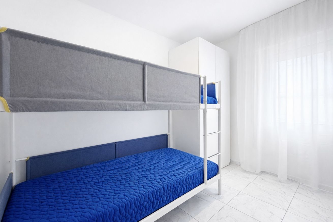 La soluzione dispone di tre camere, due con letto matrimoniale e una con letto a castello. Due bagni completi con box doccia.